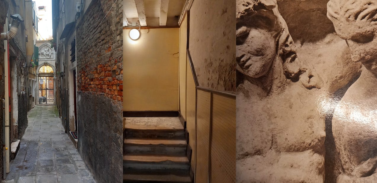 Venice calle’s, the entrance to the flat, a book cover I found in Aqua Alta bookshop
